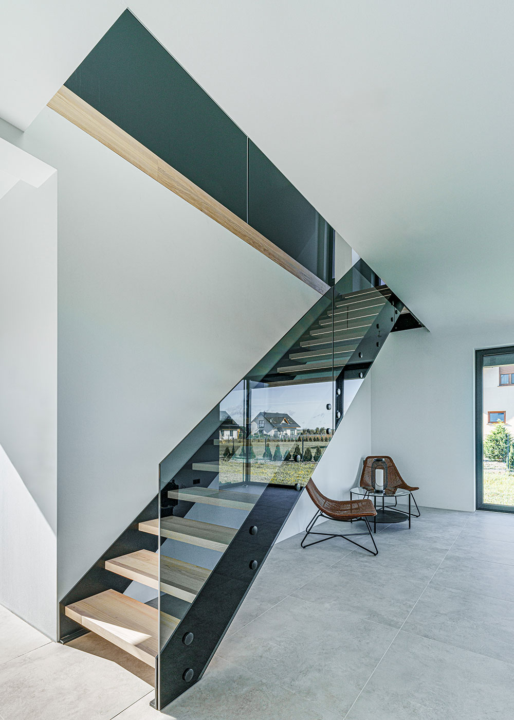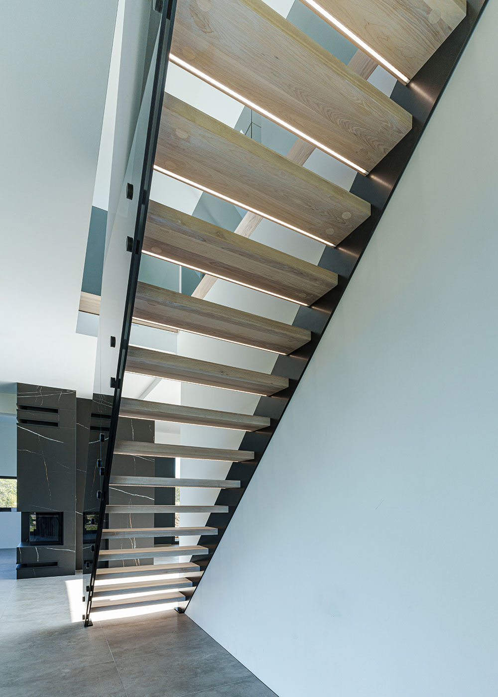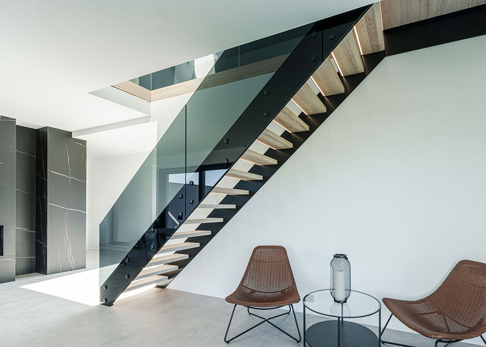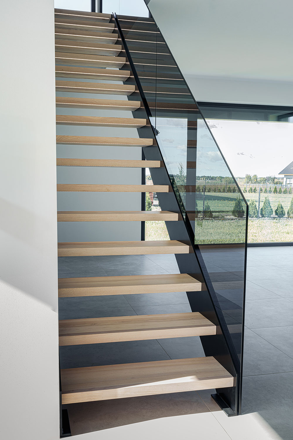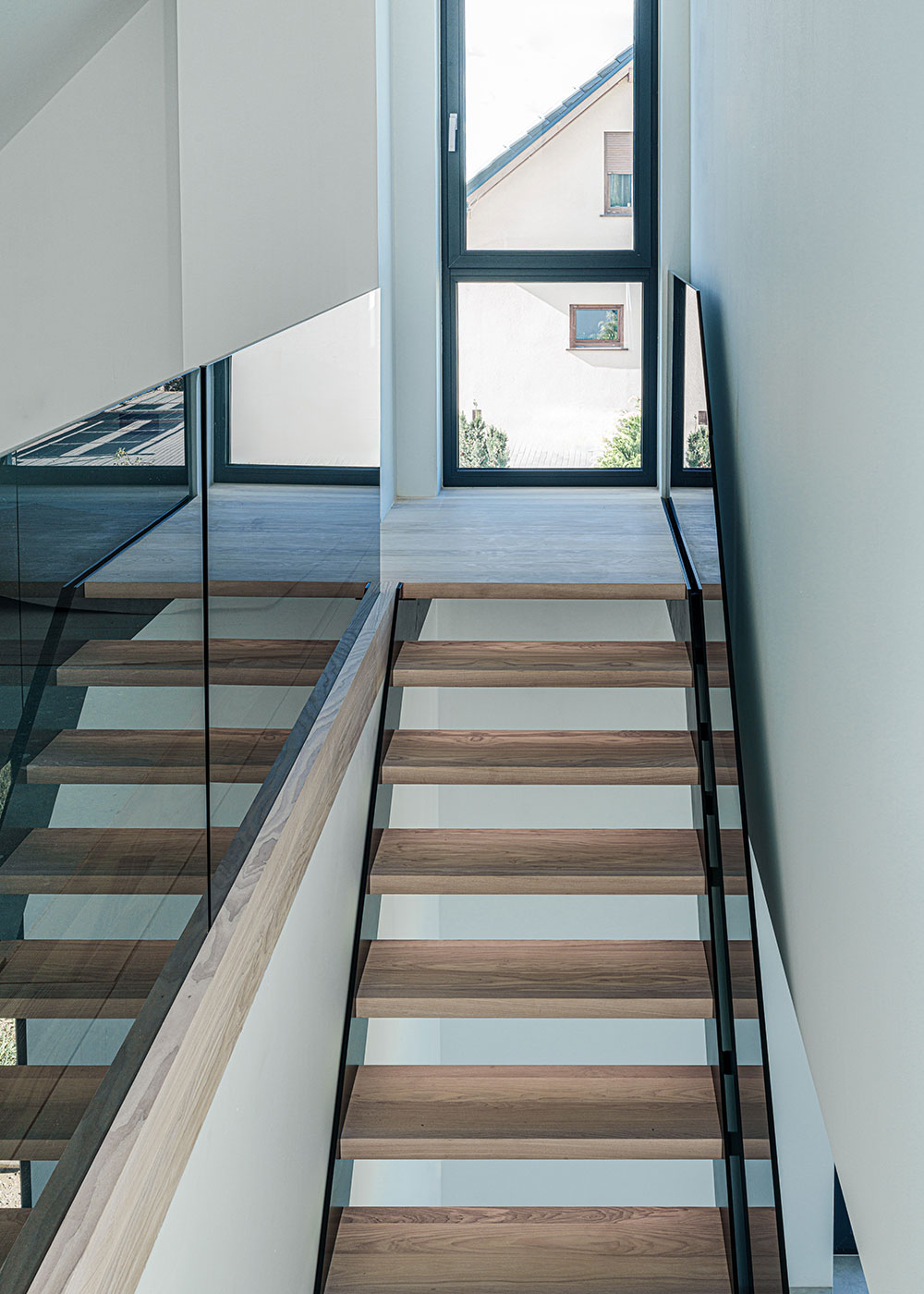 Stufen – Esche weiß geölt, Stahlwange und Stahlhandlauf