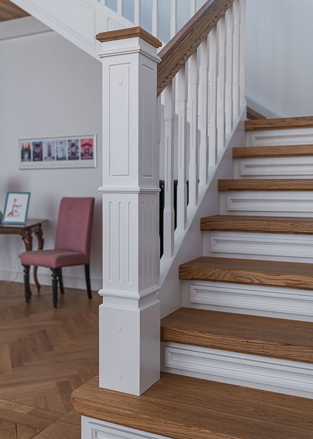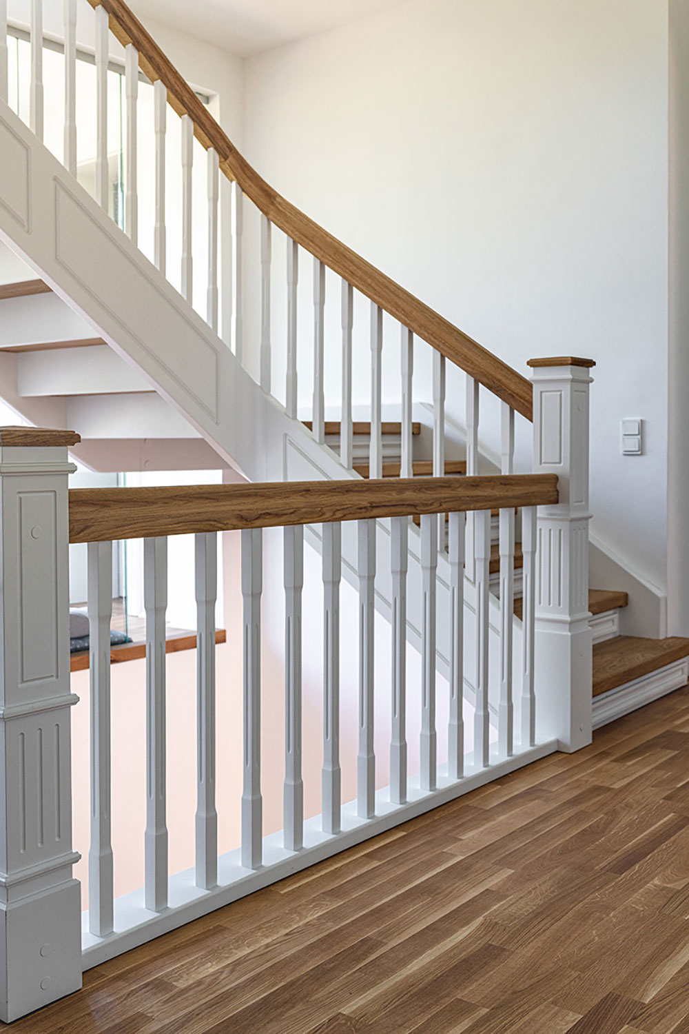 Wange, Stäbe, Pfosten und Setzstufen Erle deckend weiß lackiert nach RAL