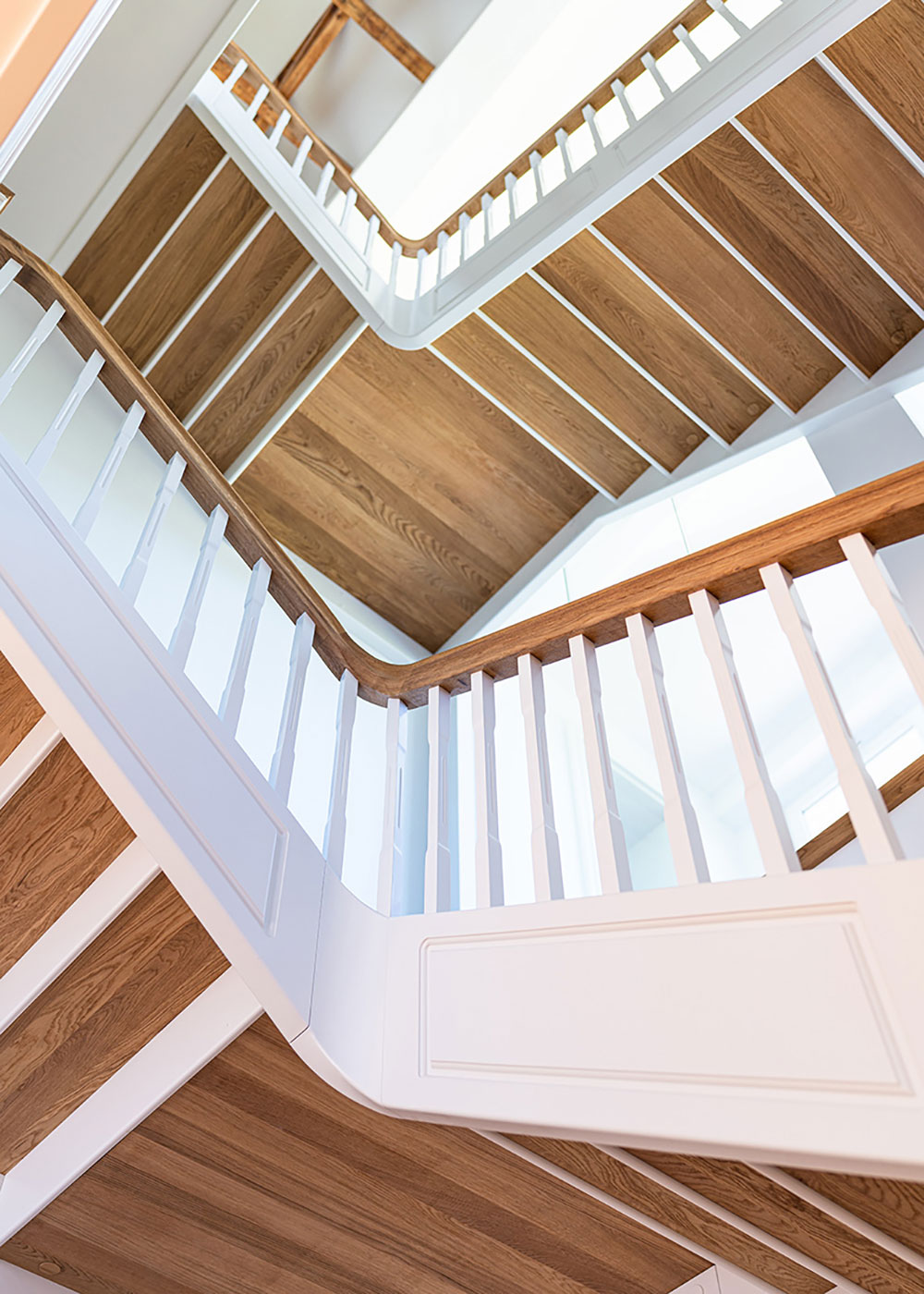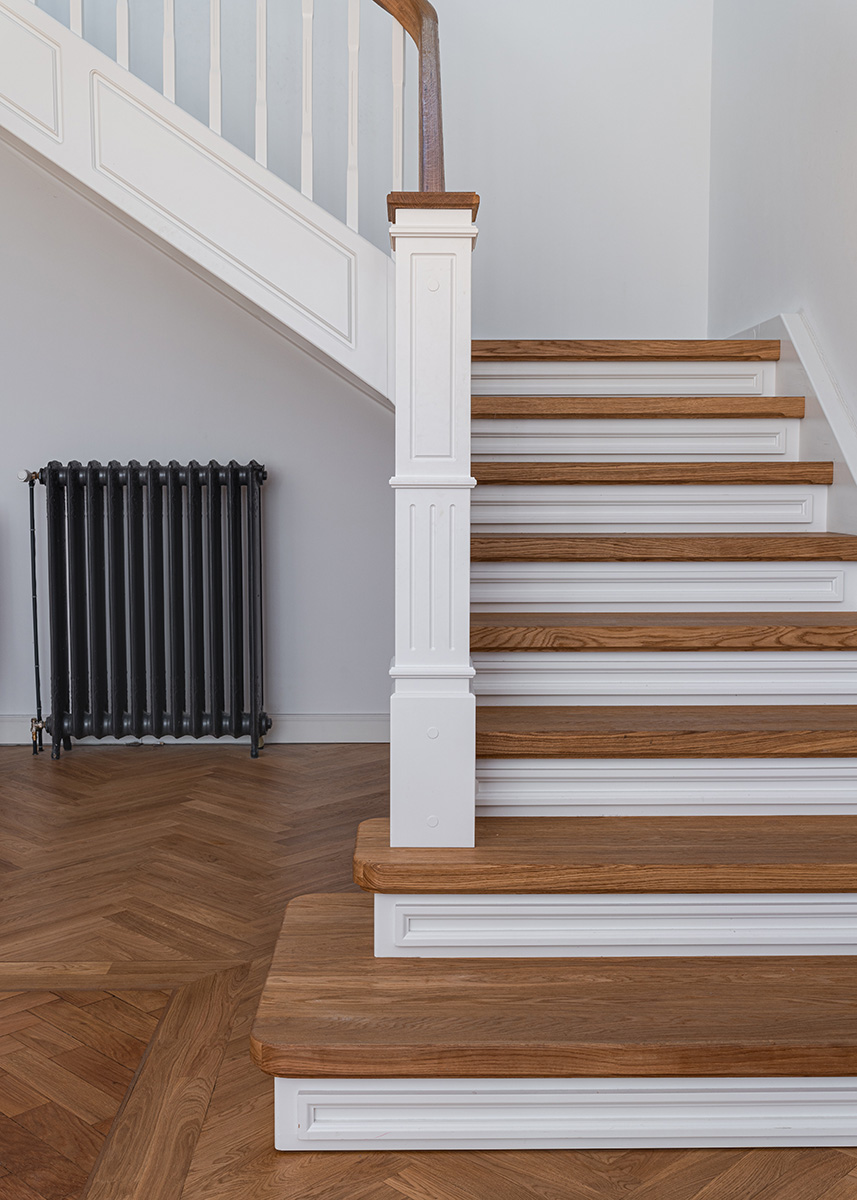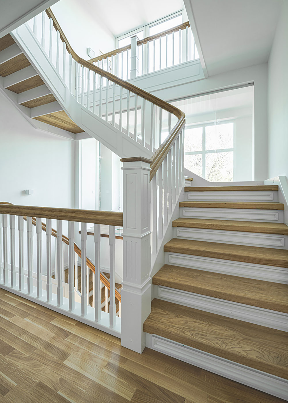 2 x 1/4 gewendelte, geschlossene Wangentreppe mit zwei Podesten, Handlauf – und Wangenkrümmling, profilierte Wange und Setzstufen mit Leisten