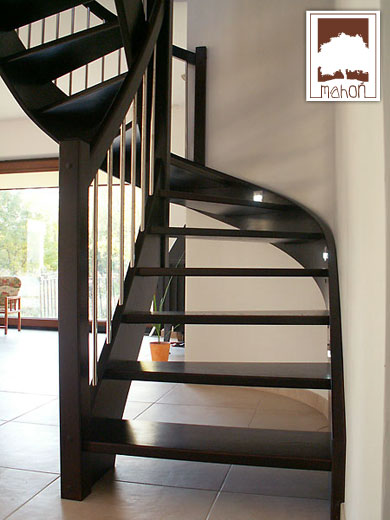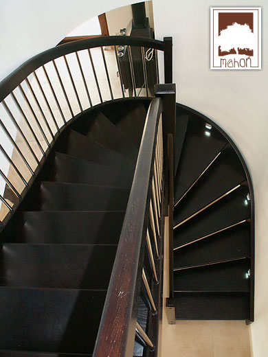 1/2 gewendelte, offene bogengeformte Wangentreppe, wandseitig an ein rundes Treppenhaus angepasst, Wandwange mit